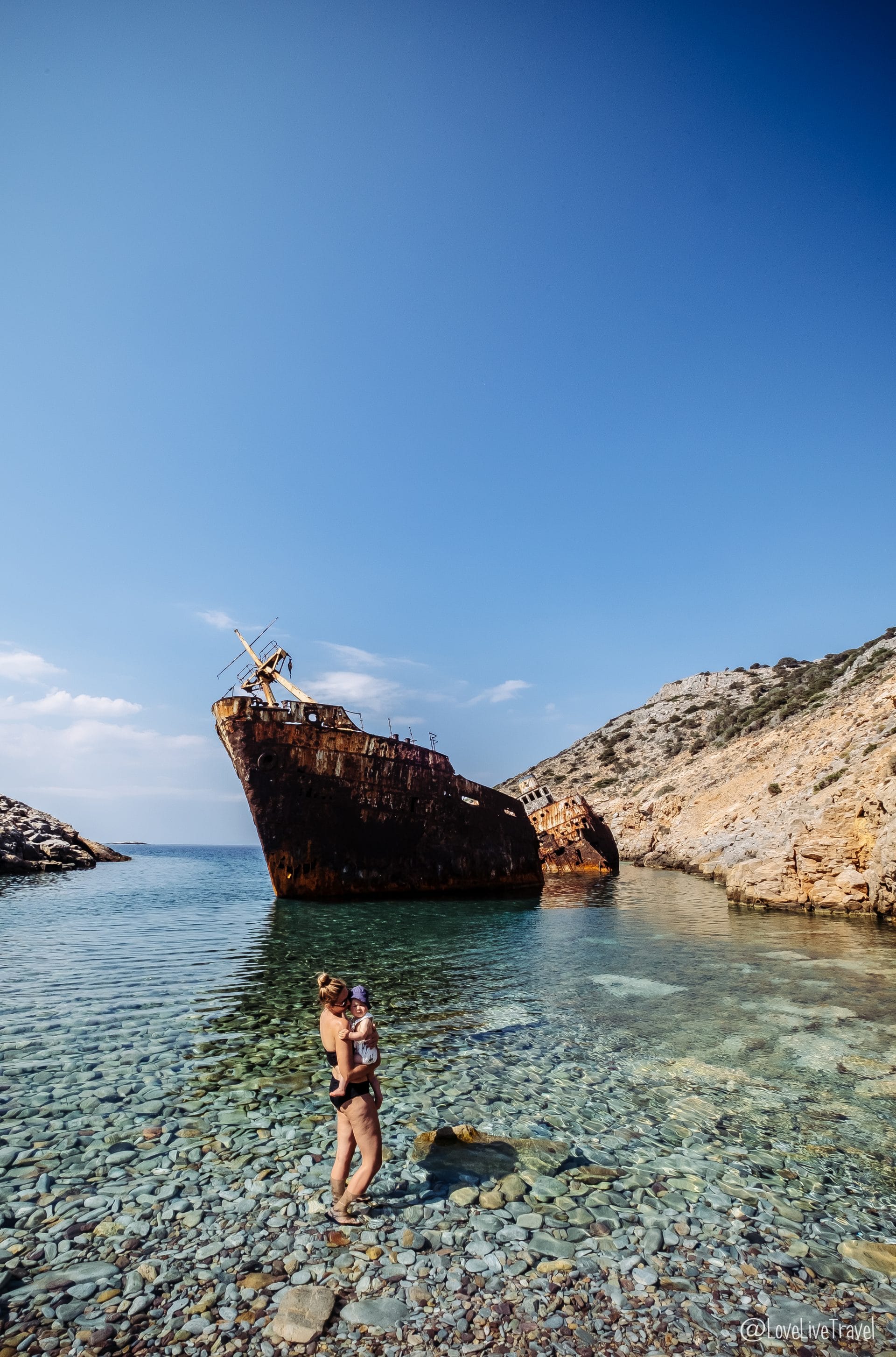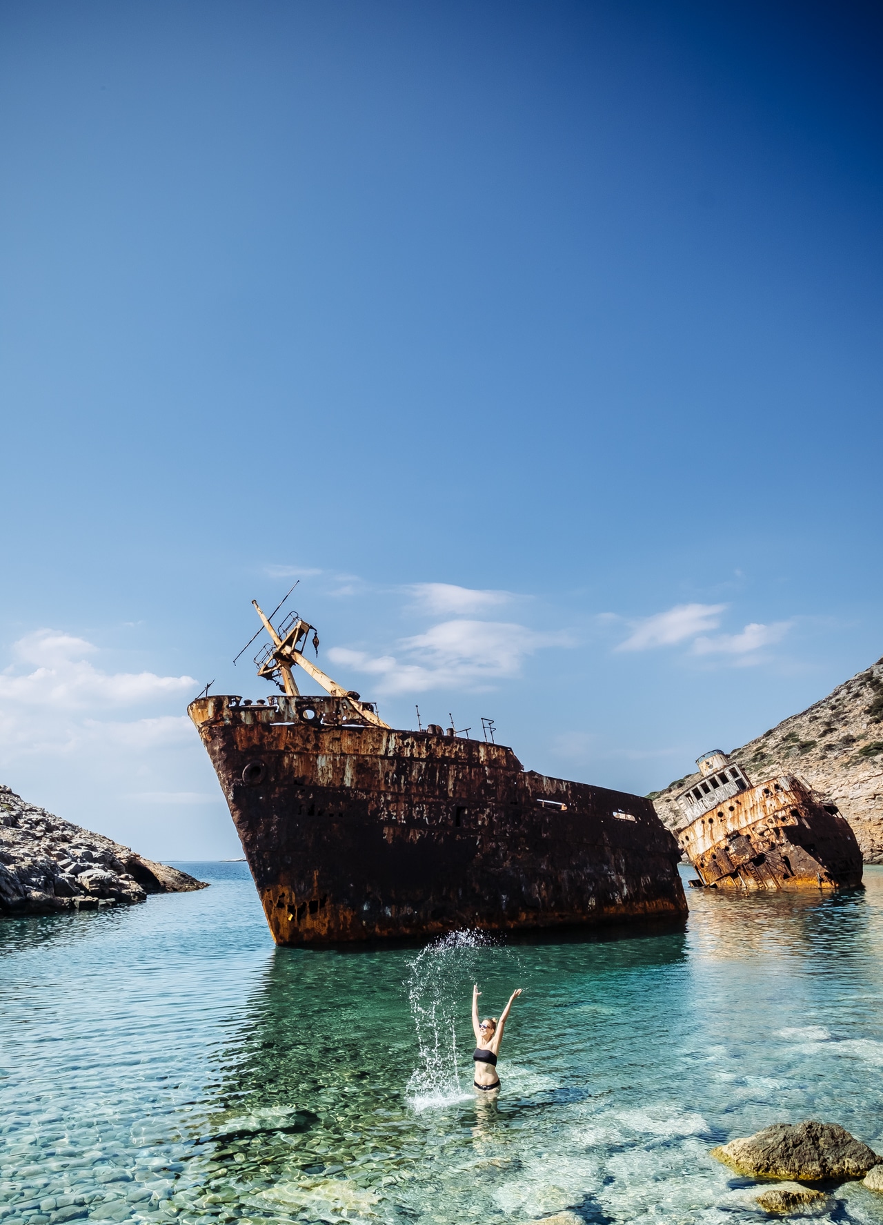 Panorama de dingue et bonne nourriture. Que demander de plus ??? Surtout, prend des forces, car, tu vas te rendre ensuite, auprès de l’épave de bateau la plus célèbre du cinéma : celle qui apparaît dans le Grand Bleu. Tu la trouveras sous le nom Olympia dans google maps. Là-encore, une petite marche de 20min pour rejoindre la crique où le bateau est échoué, sous le soleil qui cogne à mort ! Mais, récompense ultime, tu peux te baigner ;-).